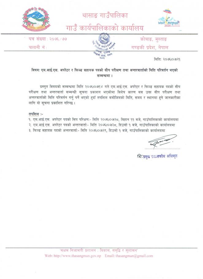 » एम आइ एस अपरेटर र फिल्ड सहायक पदकाे सीप परीक्षण तथा अन्तरवार्ताकाे मिति परिवर्तन भएकाे सम्बन्धमा ।