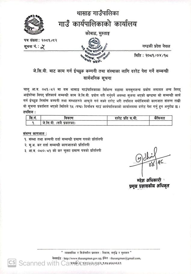 जे.सि.बी. बाट काम गर्न ईच्छुक कम्पनी तथा संस्थाका लागि दररेट पेश गर्न सम्बन्धी सार्वजनिक सूचना ।