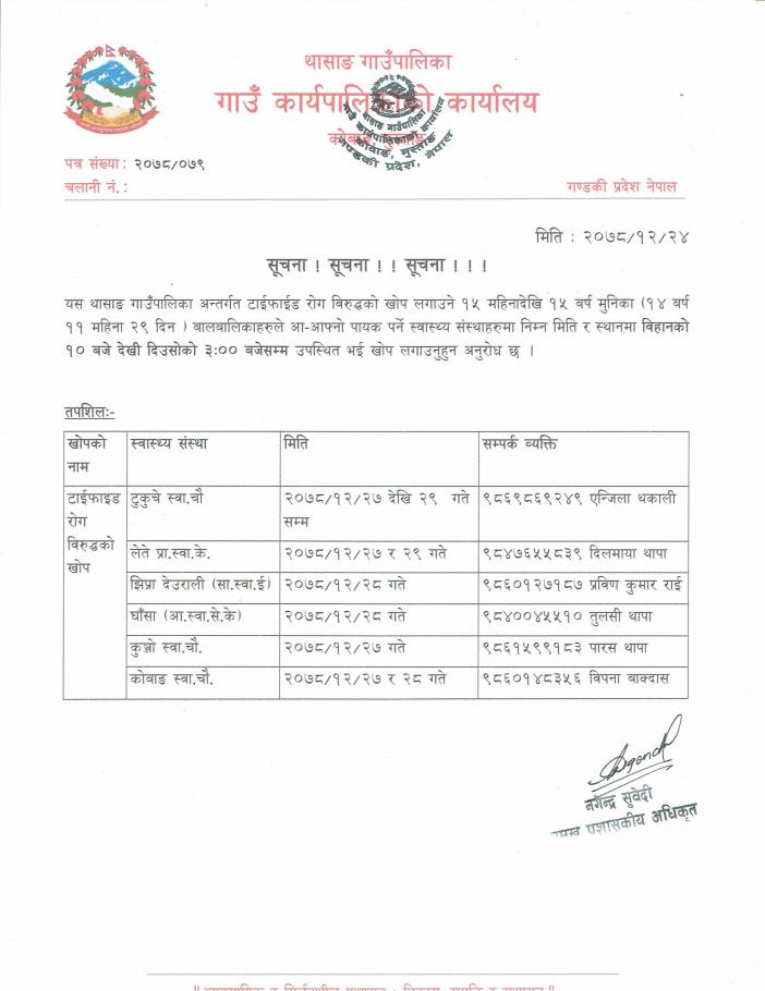 थासाङ गाउँपालिका अन्तर्गत टाईफाईड रोग विरुद्ध खोप लगाउने सम्बन्धी जरुरी सूचना