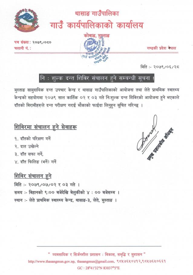 नि : शुल्क दन्त शिविर संचालन हुने सम्बन्धी सूचना !