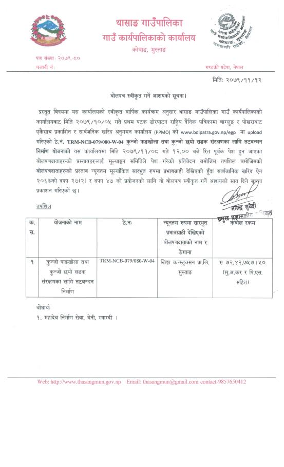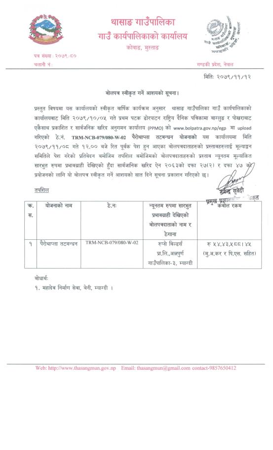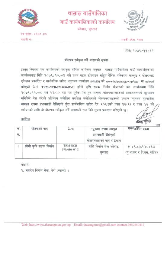 बोलपत्र स्वीकृत गर्ने आशयको सूचना