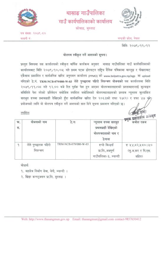 » बोलपत्र स्वीकृत गर्ने आशयको सूचना