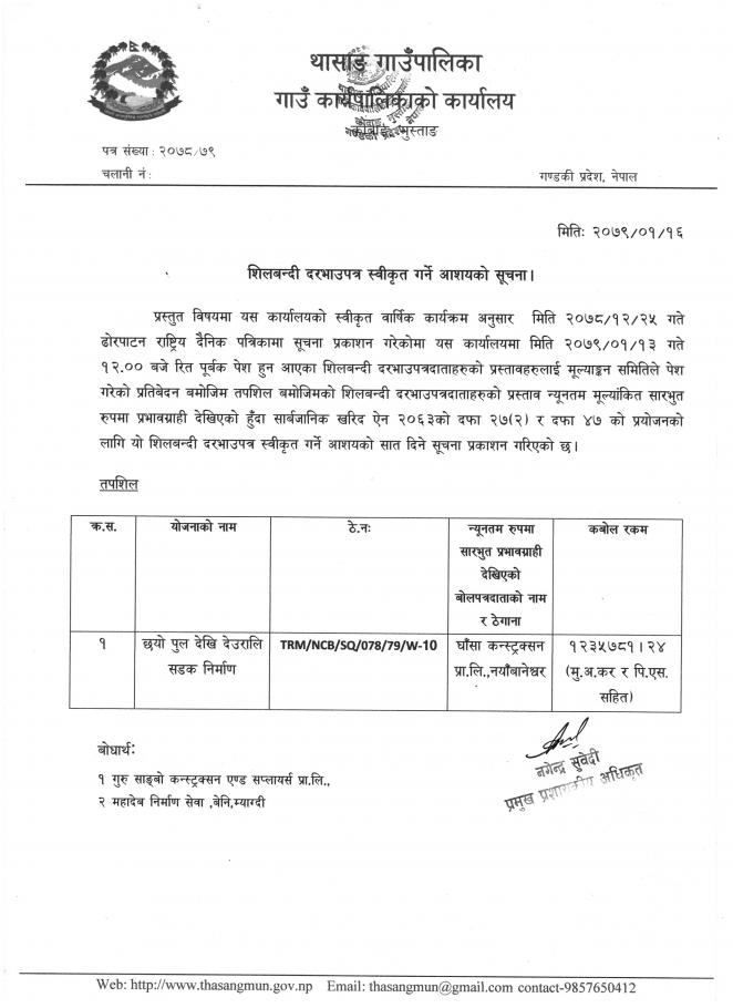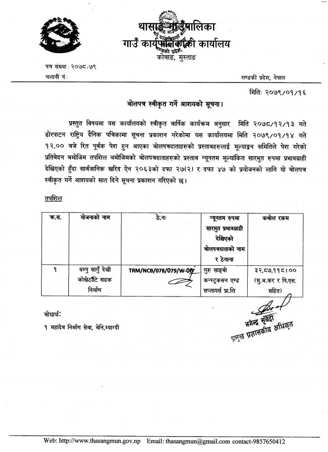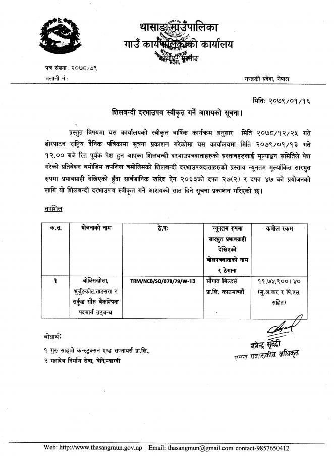 बोलपत्र स्वीकृत गर्ने आशयको सूचना।