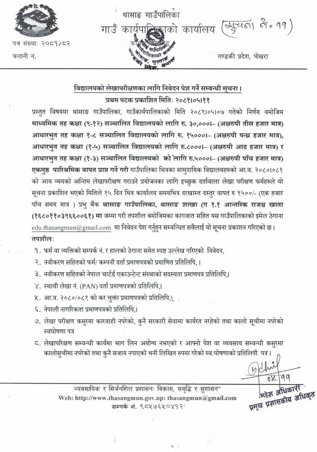 विद्यालयको लेखापरीक्षणका लागि निवेदन पेश गर्ने सम्बन्धी सूचना ।