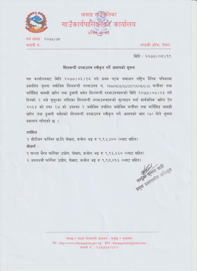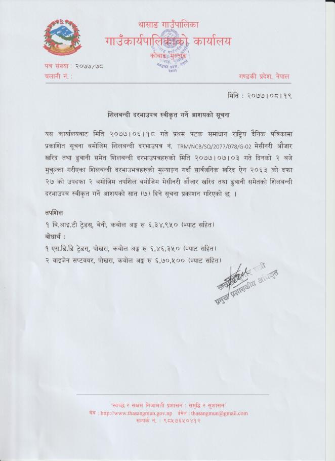 बोलपत्र स्वीकृत गर्ने आशयको सूचना।