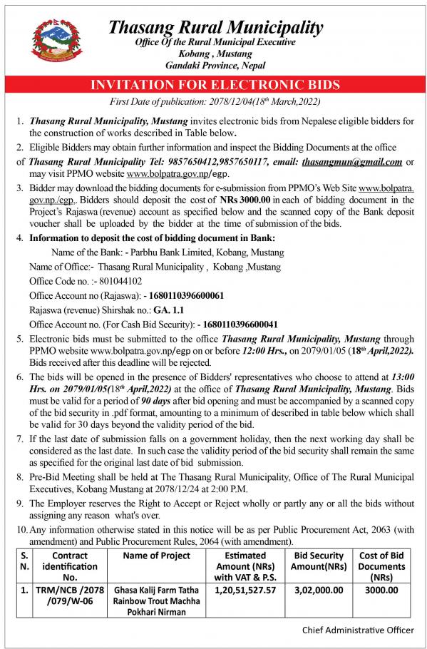 INVITATION FOR ELECTRONIC BIDS - Ghasa kalij Farm tatha Rainbow Trout Machha Pokhari Nirman