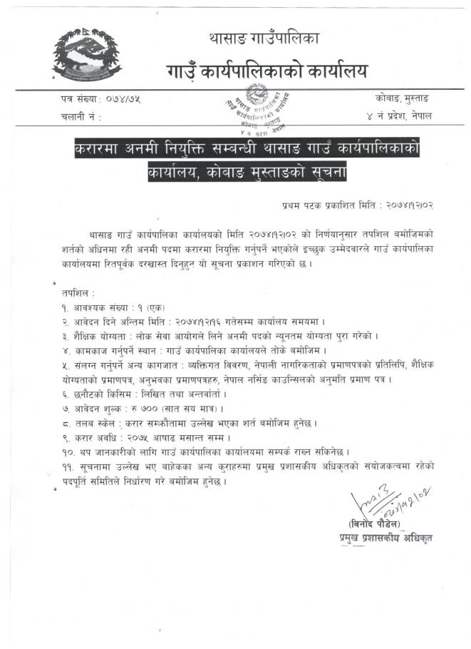 » करारमा अनमी नियुक्ति सम्बन्धी गाउँ कार्यपालिका कार्यालयकाे सूचना ।