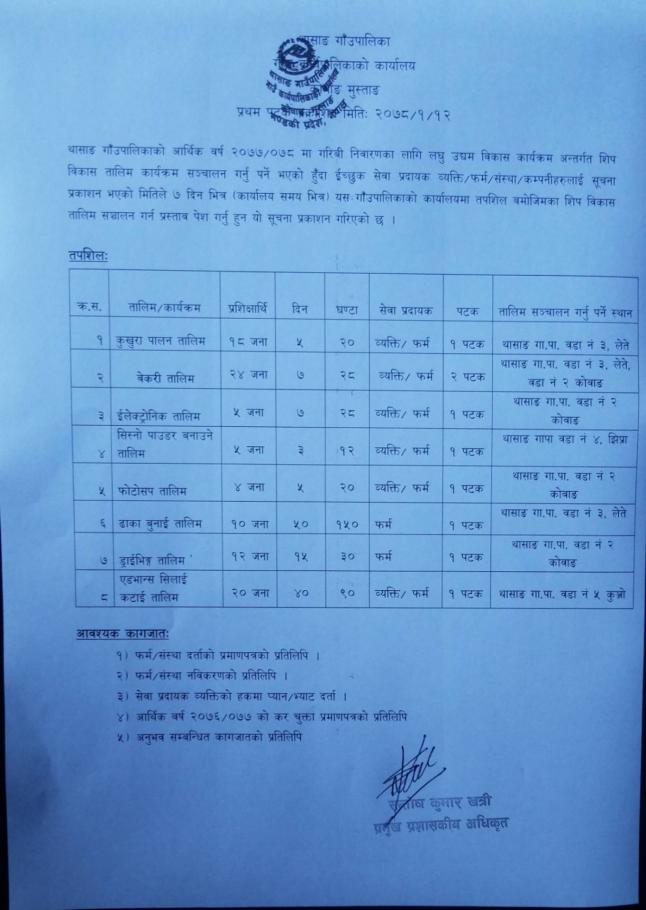 गरिबी निवारणका लागि लघु उद्यम विकास कार्यक्रम अन्तर्गत सीप विकास तालिम कार्यक्रम सञ्चालन सम्बन्धी ७ दिने सूचना ।