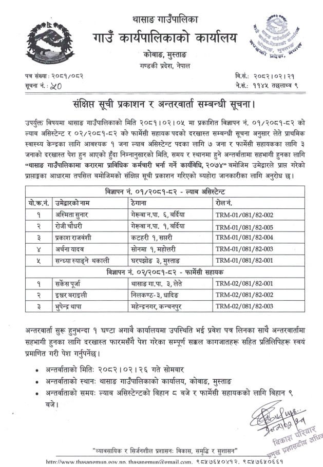 संक्षिप्त सूची प्रकाशन र अन्तरवार्ता सम्बन्धी सूचना।