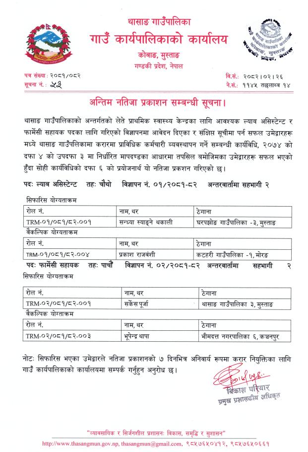 अन्तिम नतिजा प्रकाशन सम्बन्धी सूचना।